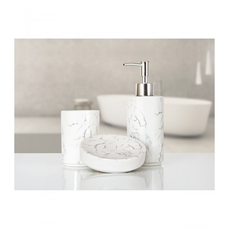 Состав: полирезин (устойчив к падению) Комплектация: – дозатор для мыла – мыльница – стакан для зубных щеток